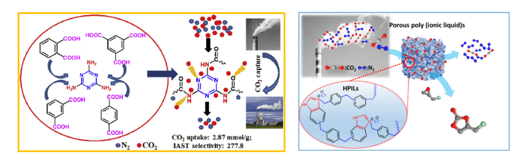 图4 功能化超交联聚合物对二氧化碳的选择性捕集与转化