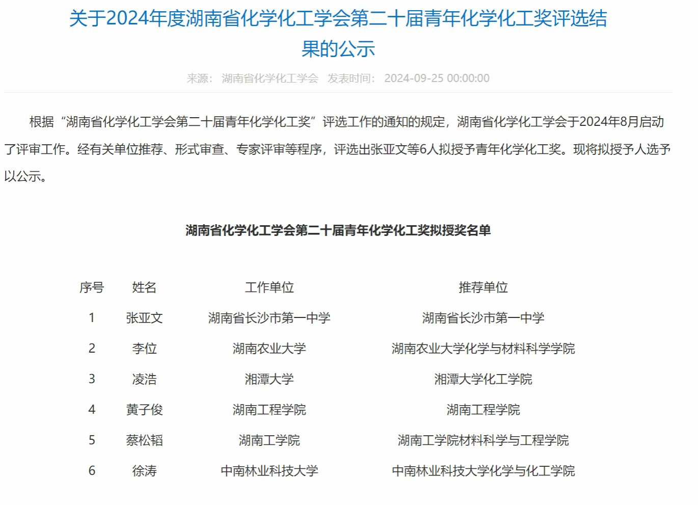 近日,我院徐涛老师在2024年度湖南省化学化工学会第二十届青年化学化工奖评选中成功获奖。湖南省化学化工学会的青年化学化工奖是学会的一项重要奖项,旨在表彰在化学化工领域表现突出的本省青年学者。徐涛老师凭借其在科研和教学方面的优秀成绩,经过层层筛选,最终获此殊荣。