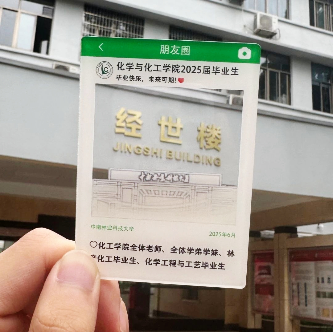 朋友圈祝福透卡框采用清新绿色背景,设计成朋友圈样式,创意满满。卡片虽小,却承载着学院全体老师和同学们对毕业生深深的祝福。
