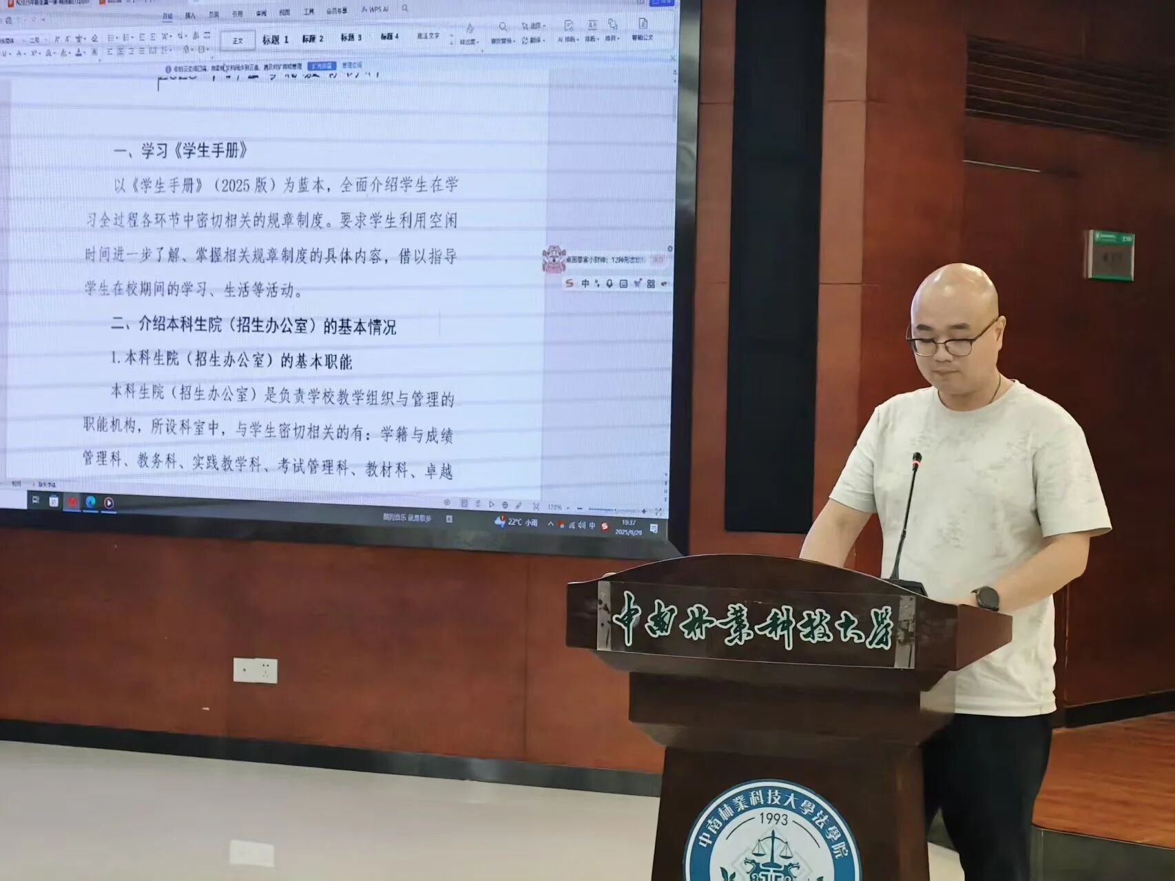 2025级新生辅导员李斯为同学们详细讲解了校纪校规与学籍管理相关制度,介绍了常见问题的解决途径与咨询通道。围绕学籍管理、学分认定、考试要求等新生普遍关注的内容,他逐一作出细致解读,有效回应了同学们初入大学阶段的诸多疑问,帮助大家更顺利地适应全新的大学生活。