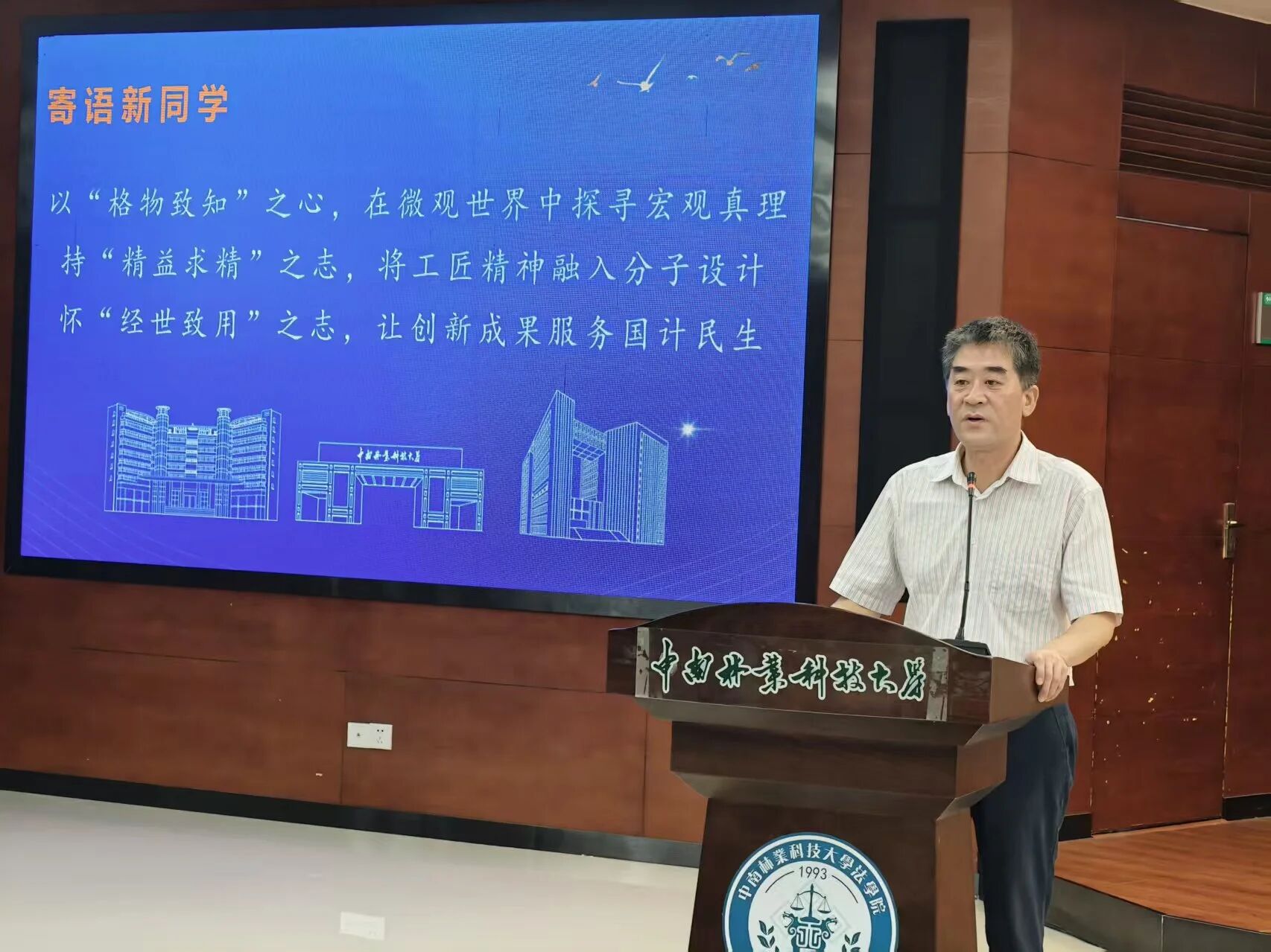杨国恩代表学院向全体新生致以热烈的欢迎。他围绕学院历史、机构设置、学科与专业、办学条件、科研工作以及人才培养特色与成效等六个方面,系统而生动地介绍了学院的整体发展概况。他勉励同学们要以优秀校友为榜样,善于利用大学各类资源,时刻牢记安全、绿色与责任,勇于创新,敢于直面并解决新问题。最后,他特别凝炼了三句话寄语新生:以“格物致知”之心,在微观世界中探寻宏观真理;持“精益求精”之志,将工匠精神融入分子设计;怀“经世致用”之志,让创新成果服务国计民生。