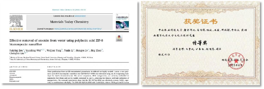 博学审慎,明辨笃行。有着扎实专业基础的她活跃在各项化工学科竞赛中,注重学以致用,学用结合。她曾作为团队队长参加化工设计竞赛,获得了全国大学生化工设计竞赛三等奖、湖南省化工设计竞赛二等奖,作为主要参与人员,获得湖南省化工设计竞赛特等奖、全国仿真创新应用大赛二等奖、湖南省虚拟仿真竞赛二等奖。砥砺深耕,探索真知。参加多次竞赛后,她的逻辑思维能力、分析解决问题能力大幅提升,科研兴趣也逐渐浓厚。她决定继续培养科研能力,主动参与魏元峰老师主持的生物质基复合吸附剂去除水中As(Ⅲ)研究项目。她有针对性地阅读相关中英文文献,并在空闲时间有计划地开展实验,即使实验失败也并没有磨灭其对科研的兴趣,反而进一步培养了她的创新意识和钻研精神。最后她先后以第二作者和第一作者的身份于在《Materials Today Chemistry》(IF=7.92,JCR一区)发表两篇学术论文。