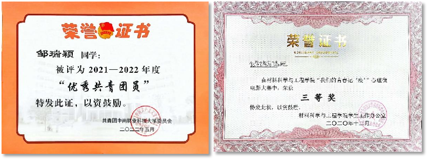 思想先行,以诚待人。“唯有坚定的理想信念,才能支撑起伟大的思想体系”。邹瑞颖进入大学后便递交了入党申请书,现已光荣成为一名中共党员。在这期间,她认真完成组织交给的任务,积极参与主题党日活动,配合党支部开展学习帮扶、党员巡考、二十大宣讲等各项活动,曾获积极分子培训班“优秀学员”、校“优秀共青团员”称号。她担任班级心理委员和学院综合办公室干事,在工作期间始终以服务同学为宗旨,工作认真细致,赢得老师和同学的好评和支持,被评为优秀干事;曾作为导演带领专业同学拍摄心理微电影《涅槃》,并在学院心理微电影大赛中获三等奖,被授予“朋辈心理互助员”称号。