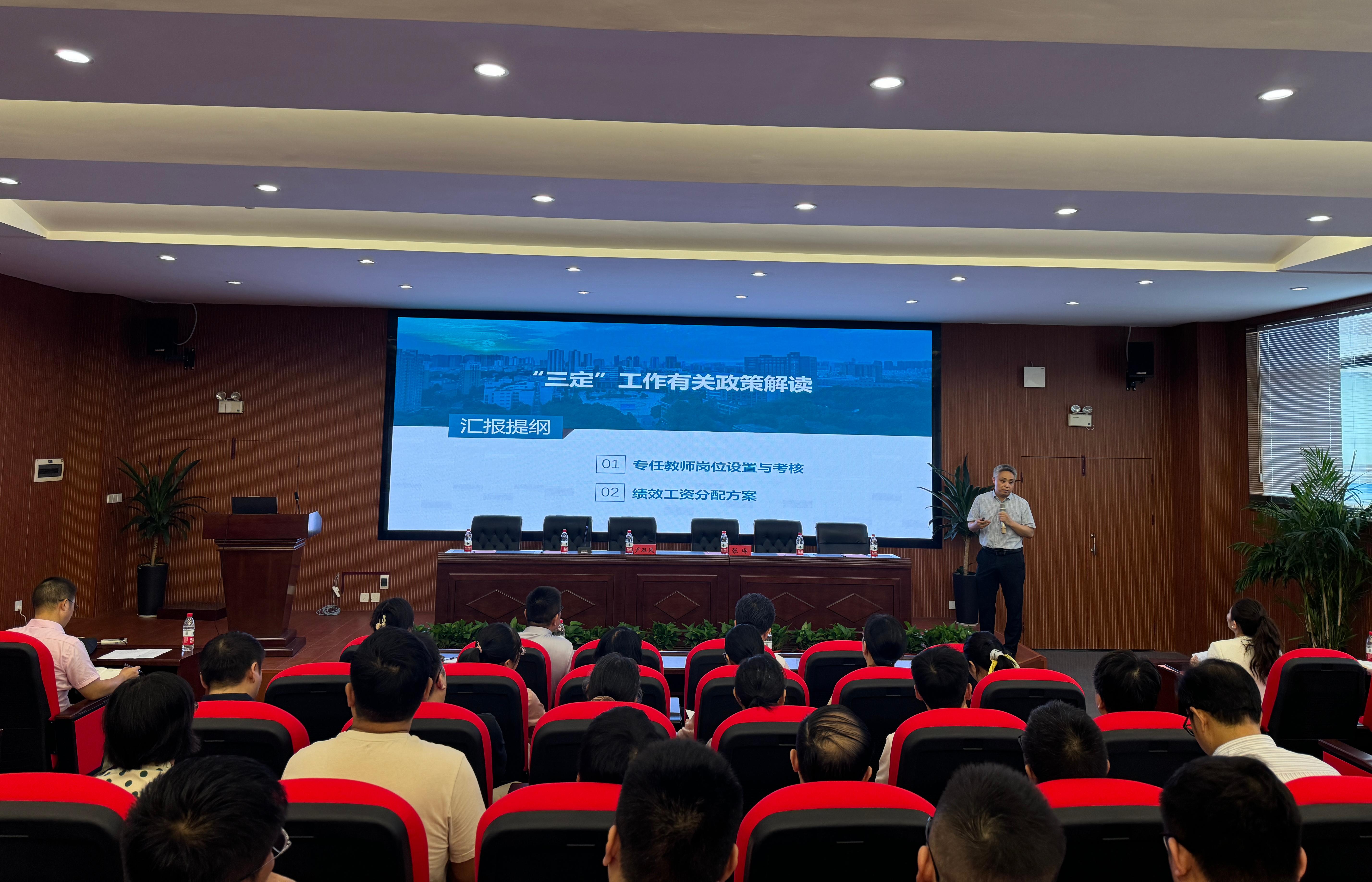 会议伊始,学院邀请人事处处长张琳为全院教职工宣讲、解读学校“三定”工作方案及相关政策。他从专任教师岗位设置与考核、绩效工资分配方案等两个方面,围绕改革布局、方案制定、岗位设置、聘用及考核等环节进行全面阐述,并现场解答老师们的疑问。