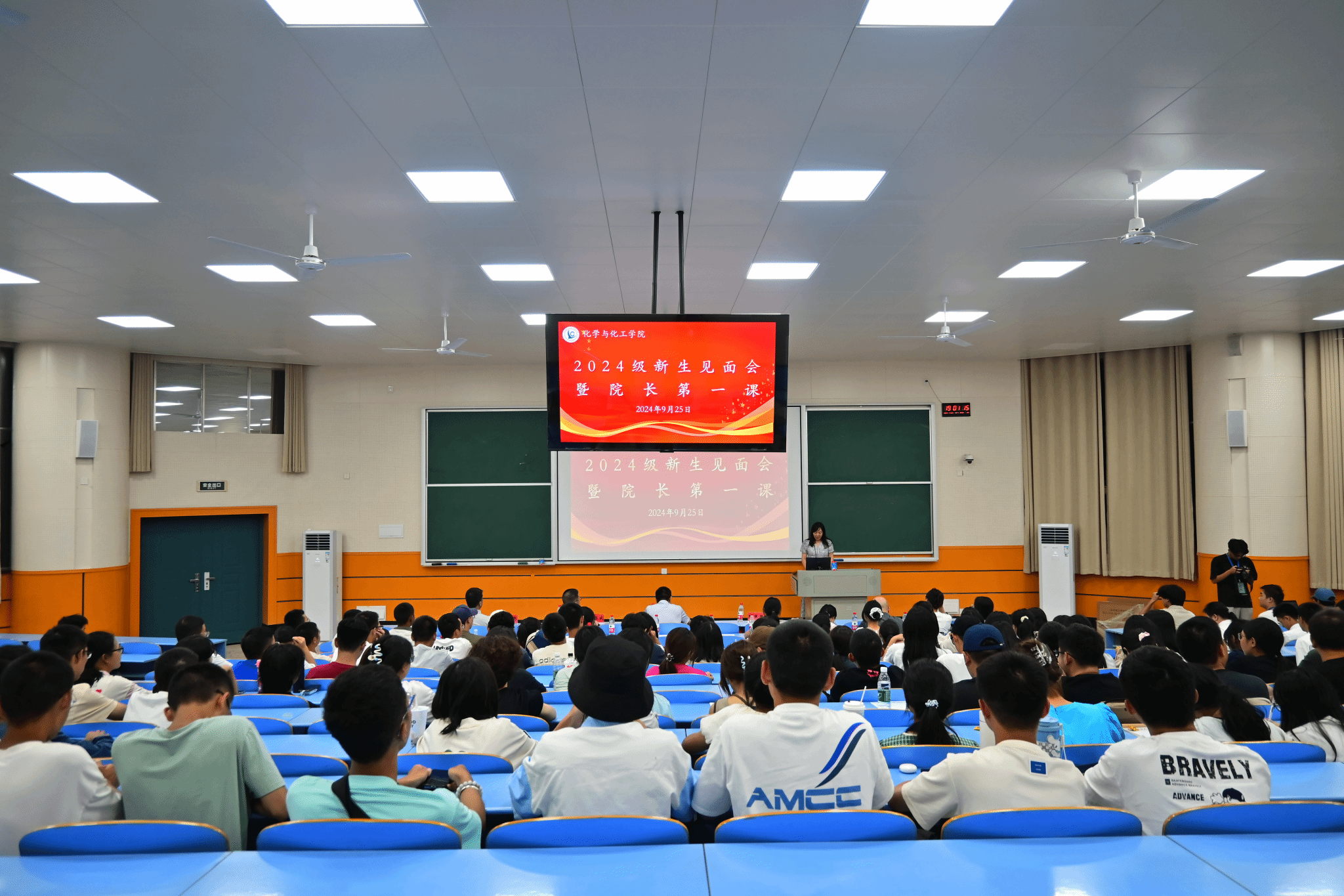 2024年9月25日晚上,化学与化工学院全体院领导、辅导员、2024级班主任及新生齐聚一堂,在庄严的国歌声中,院长第一课正式拉开序幕。学院党委副书记陈慧慧主持本次会议。