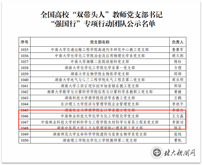 近日,教育部思政司公示,我校化学与化工学院化学党支部和材料科学与工程学院木材科学与家具工程系党支部双双入选全国高校“双带头人”教师党支部书记“强国行”专项行动团队,林学院、水土保持学院经济林教工党支部入选湖南省高校“双带头人”教师党支部书记“强国行”专项行动团队。进一步丰富了学校“对标争先”全国培育创建类型,提升了党建“双创”工作质效。