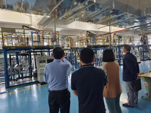 谢练武介绍了此次调研交流的目的是为化工专业本科生寻求更合适的实习方向。同时,他介绍了我校化学与化工学院在师资队伍建设、人才培养、一流专业一流课程建设、学科建设、产教融合、科研项目、科研成果等方面情况。希望以此次调研为契机,希望双方深化交流合作,实现实训基地共享,促进共同发展。随后,在唐院长陪同下参观了煤制甲醇仿真实训工厂、啤酒生产车间、化工单元操作训练中心、GMP实训车间、精馏工艺综合训练中心和废水处理系统等实训基地。据悉,湖南化工职院的实训大楼是目前湖南大学、湖南师范大学、长沙理工大学、长沙学院、湘潭大学等高校化工与制药类专业的实习实训基地。这里不仅配备了完备的中试生产线,更是模拟了中国神华集团的工业生产线进行缩小,让学生们有机会在真实的环境中进行深入且富有成效的实操训练。